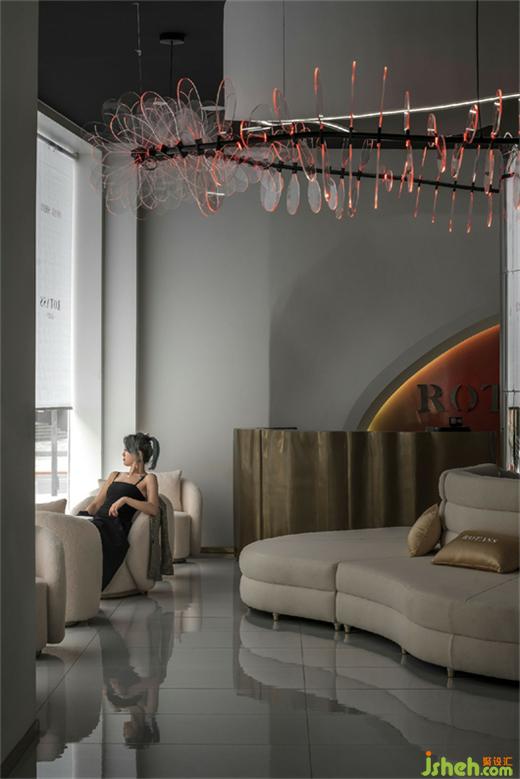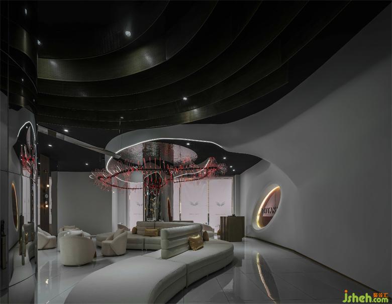 The function of the front hall, different from the traditional commercial display cabinets, is served as a area for customer reception and tea break. Sofa sets and seats are set along the side of the French window. The comfortable scene clearly distinguishes customized services from traditional business models. The ceiling decoration is a perfect combination of point, line and surface elements. The designer puts the light belt around the column in an irregular line shape, and the red light diffuses on the metal corrugated plate, artificially dispersing the light. The flowing light falls on the jewelry on display, highlighting the sparkling texture of diamond.