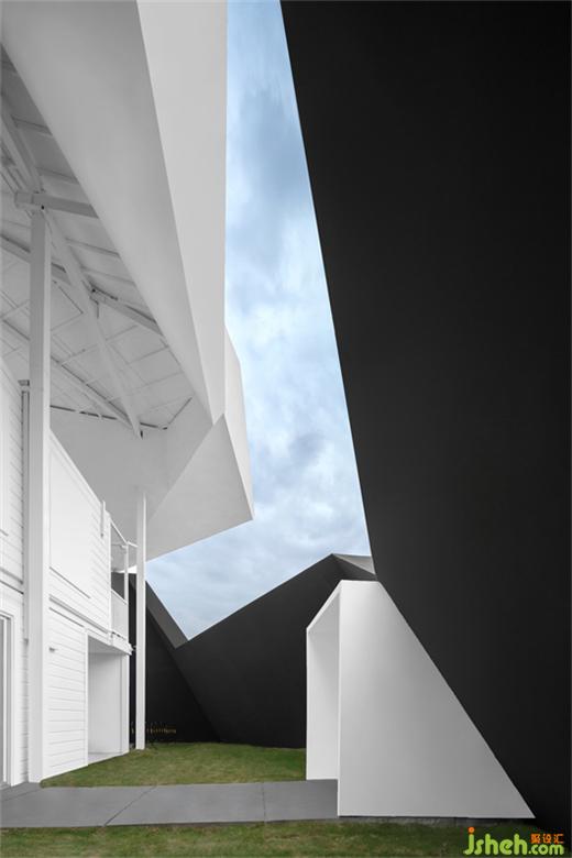 美術(shù)館設(shè)計(jì)改造過程中,建筑外部空間有了顛覆性的創(chuàng)新表現(xiàn)。圍繞原有的三個(gè)集裝箱式的鐵皮建筑,基礎(chǔ)的幾何形體結(jié)構(gòu)在二維及三維空間中相互穿插切割,形成散落于空間中的造型,且由此劃分出不同區(qū)域。