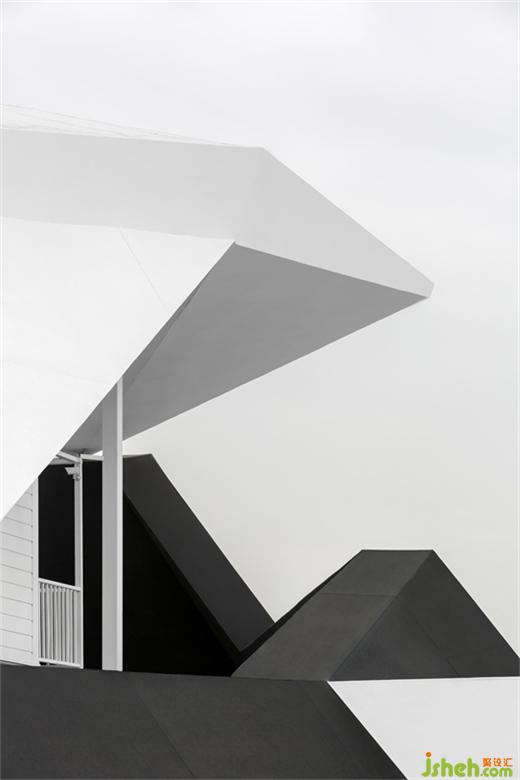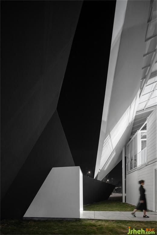 下方采用強(qiáng)化力量感的線條和切割變化的體塊把原建筑圍合起來(lái),達(dá)到一種空間的獨(dú)立感。美術(shù)館設(shè)計(jì)黑與白的色彩碰撞,石與云的結(jié)合,亦形成一種山與天的對(duì)話。打造這樣一座具有實(shí)體切割感的石頭雕塑,讓整個(gè)建筑在立面的標(biāo)識(shí)性上極具可辨性,同時(shí),矗立于草坪之上與自然風(fēng)光相得益彰。