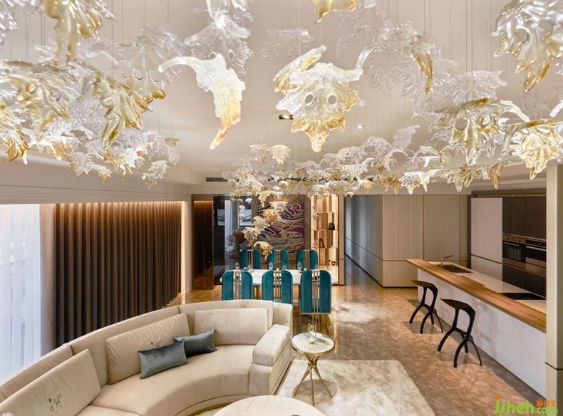 甫推開大門,手工精雕屏風(fēng)半掩玄關(guān),神秘奢華,隱藏不住該空間展示時尚意圖。金黃色夕陽透過大片落地窗灑落進(jìn)入客廳,反射在皮革家具上更顯斑斕奪目,空間色彩隨之緩緩流動,開啟與藝術(shù)品對話、以及當(dāng)代住宅設(shè)計(jì)的實(shí)驗(yàn)。