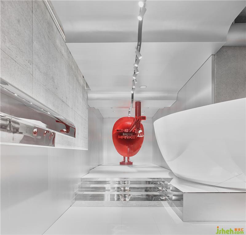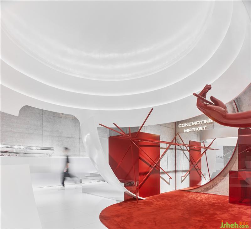 Conemoting market的空間敘述語言幾乎可以是放任的,寓言,幻覺,傷痛,童真,陷阱,曖昧,藥店,警告,科幻,撫慰,階梯,經典,劇情,可愛,黑白,紅色和欲望都被和諧地安置在一起,580平方米的空間是一個制造“線上人間”的劇場,在這里服裝高級地成為思想的表皮,咖啡可以是弄騷的道具,那么一樓的酒吧應該是通往魔界的火箭!