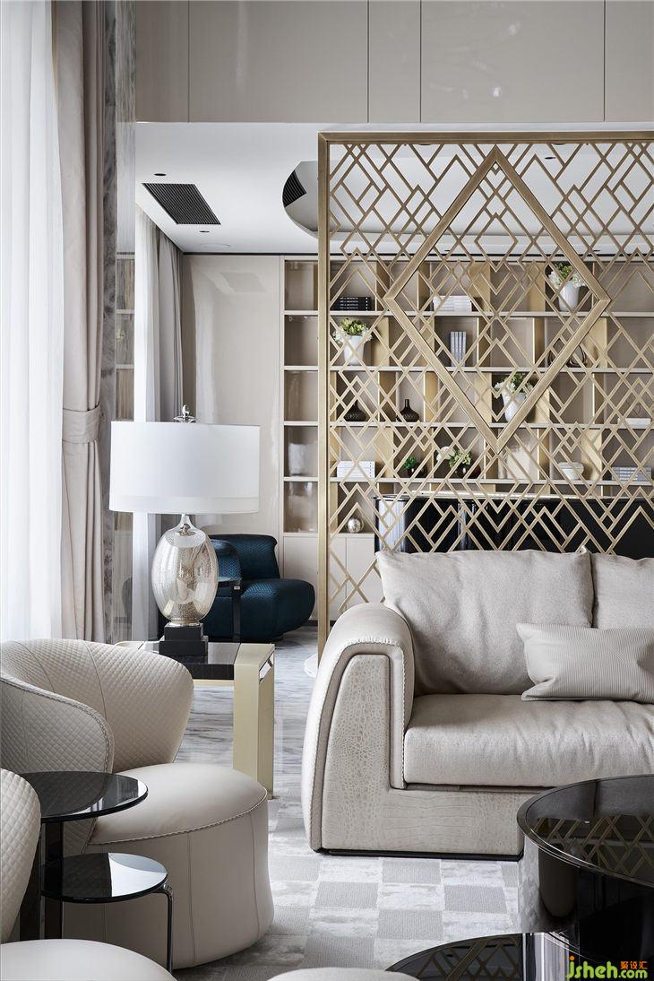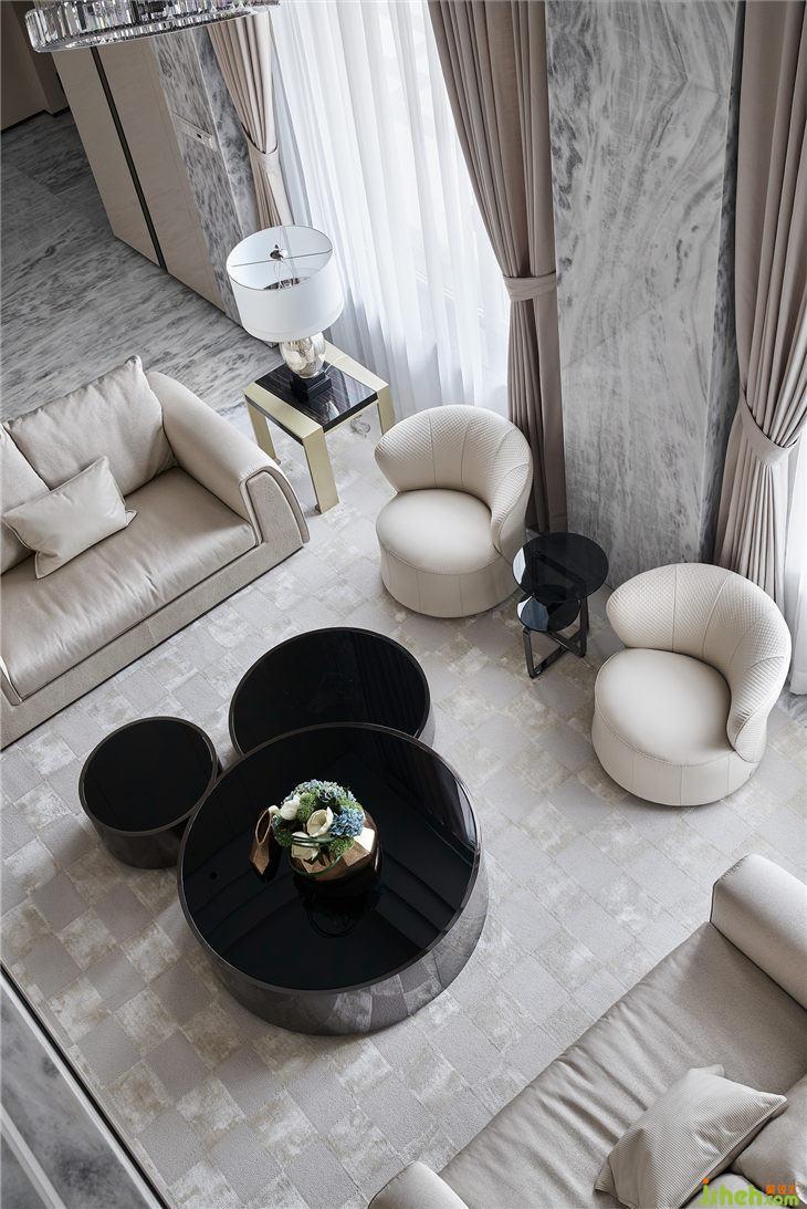 隨之進入客廳(這是原先兩套個自的門廳位置),中空挑高的設計帶來絕佳的視覺感官,落地窗承接著陽光的洗禮,極具流動線條感的大理石墻面,使整個空間干凈簡潔,呈現(xiàn)出雋永典雅的風格。米色系的多人沙發(fā)和窗簾,黑曜石般的角幾和茶幾,在自然光線的映射下產(chǎn)生鏈接,注入格紋狀的淺色系地毯,詮釋著極致奢華的當代風格。
