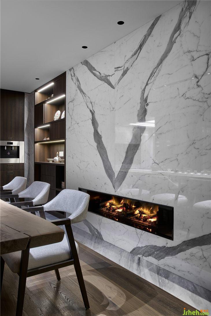 墻面用時(shí)尚的幾何切割手法,把石材做出低調(diào)而奢華的視覺(jué)感受,在隱藏形的光源配合下讓整體的光線變得更為柔和與靈動(dòng)。