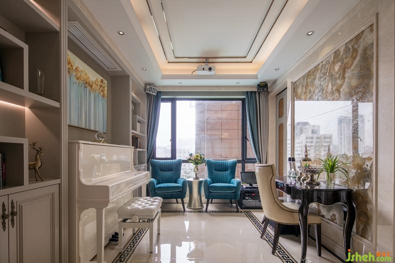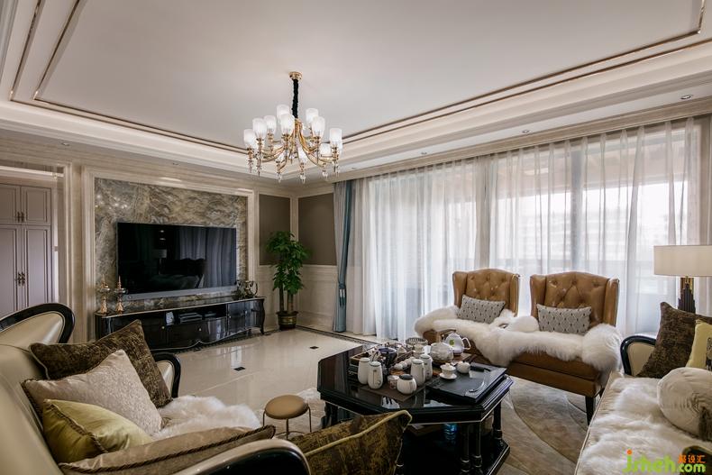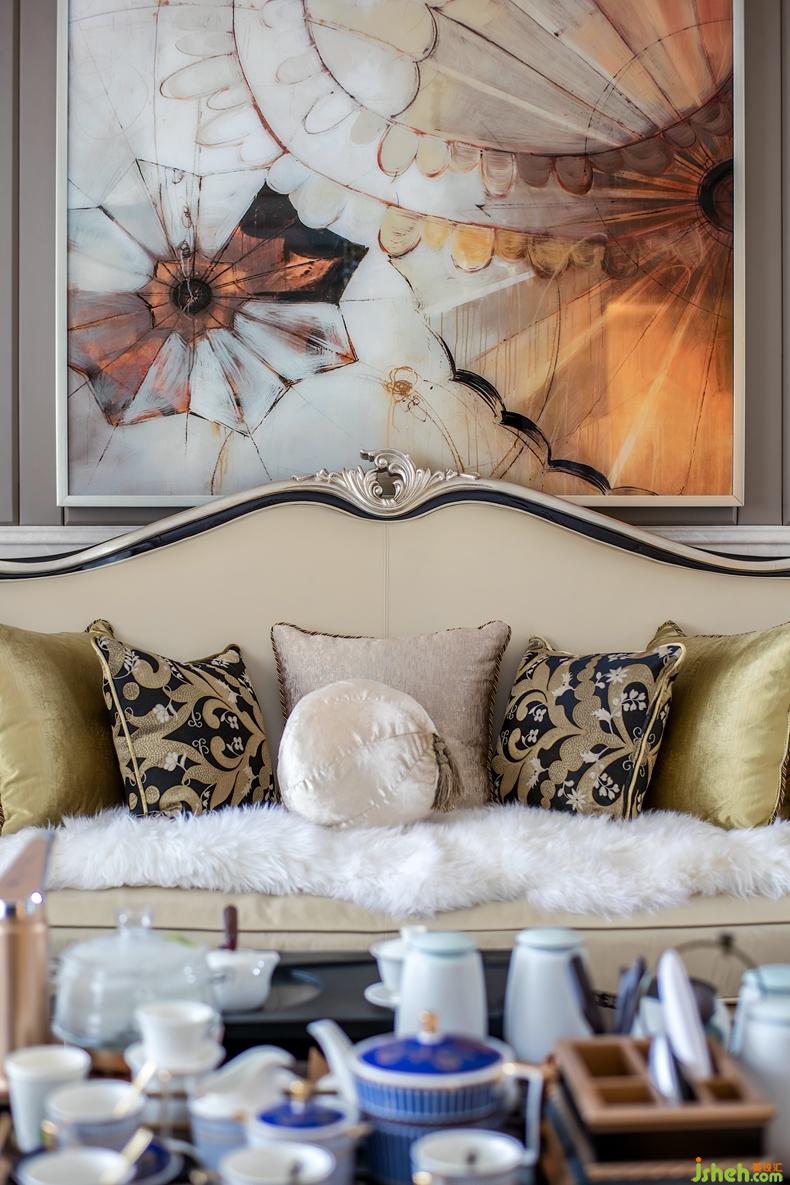 古典線條的沙發(fā)、藝術吊燈、水晶壁燈,彰顯出一種古典歐式的雅致韻味,而暗灰藍色的沙發(fā)窗簾、帶熱情橙系沙發(fā)以及帶有明亮感橙色系掛畫、與其空間有著“一脈相連”的溫暖。