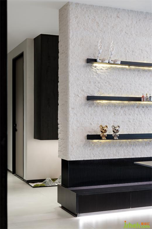 荔枝面石材的長方形壁龕,其造型與另一側公區(qū)連接處的通道相呼應,恒大御景半島裝修設計打破沙發(fā)背景墻的單調(diào),也讓空間更具聯(lián)動性和秩序感。