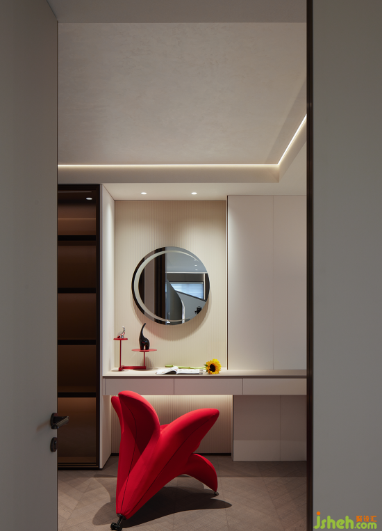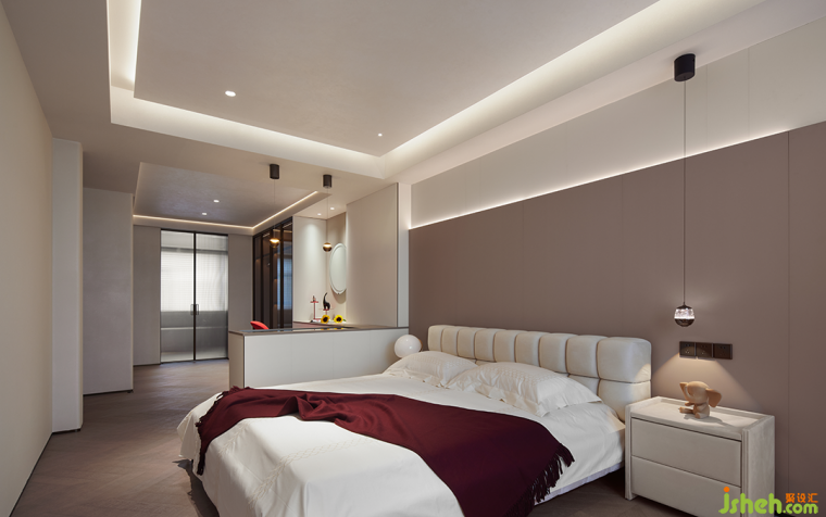 客臥之一以棕褐色調(diào)打造自然溫和的整體氛圍,褐色與紅色點綴在深邃的空間中更顯奢華,巧妙尋得完美的平衡。玻璃門衣柜簡約而不失高雅格調(diào),彰顯出大氣利落的質(zhì)感,秩序之中連接一日起居。