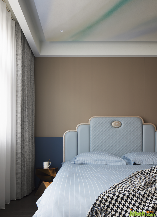 男孩房是以藍(lán)調(diào)適配棕色系的生活美學(xué),天花板的幾絲云霧、整體寢具飽含治愈……清新的感受蘊藏于細(xì)微之處,細(xì)枝末節(jié)處實現(xiàn)“人與住宅”的和諧共生。