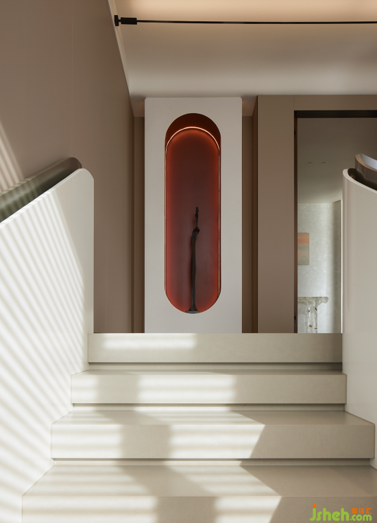 邁向位于三層的主臥,空間的層次感隨著步伐的推進(jìn)而愈發(fā)鮮明。瓷質(zhì)花瓶、玻璃桌臺與海上落日的油畫三者融合出藝術(shù)覺知,以簡而雅的線條構(gòu)造出返璞歸真的精神境界。落日余暉折射相臨,滿目皆是溫柔暖意。