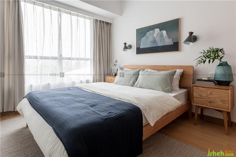 主臥延續(xù)了客廳的裝飾風(fēng)格,室內(nèi)設(shè)計師白色和木色構(gòu)筑出足夠安靜的睡眠空間;深藍色的棉質(zhì)床品,時刻呵護著睡眠健康;簡約利落的線條元素打造極簡美學(xué),如床頭的裝飾畫、柵欄推門、花瓶、床頭的首飾架等。