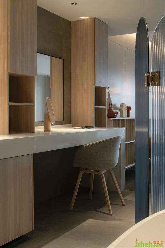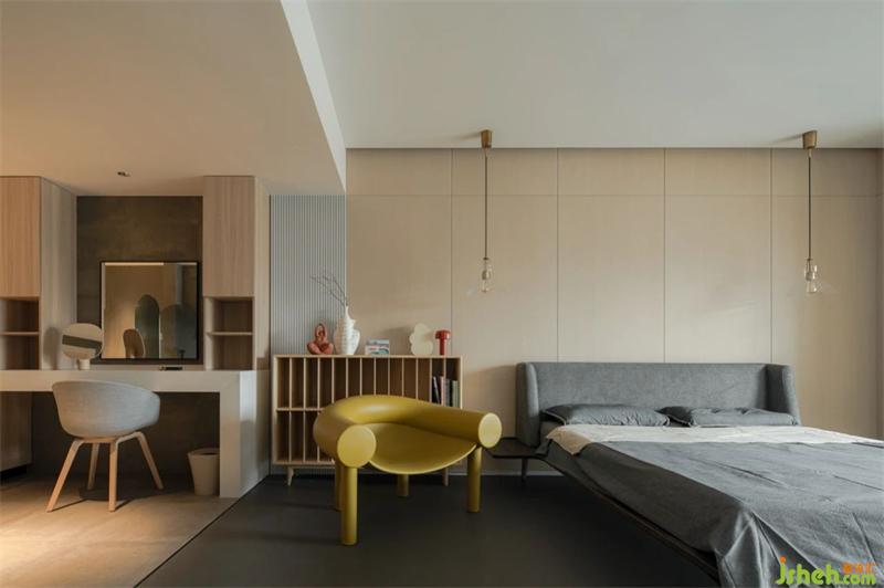 我們利用材質(zhì)的劃分將主臥室休憩區(qū)與功能區(qū)分開,半透明的屏風(fēng)使空間在若隱若現(xiàn)之間彰顯出十足的高級感。