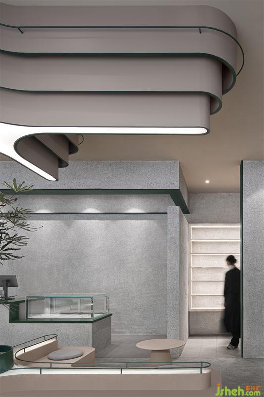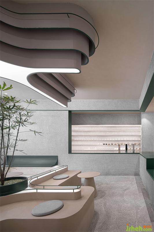 整體空間區(qū)域劃分不同,門口綠植和log的融合凸顯標(biāo)志性自然與健康的理念,門左邊玻璃的運(yùn)用使室內(nèi)通透性更強(qiáng),展示傳播產(chǎn)品制作過程,吸引路人。進(jìn)門右邊拍照打卡區(qū)不影響客人品茶聊天,左邊產(chǎn)品出品區(qū)客人隨時(shí)可觀看產(chǎn)品出品流程,也可品茶看窗外風(fēng)景