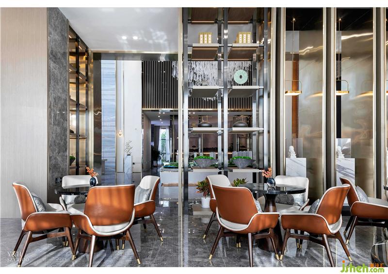 室內(nèi)空間令人舒適的暖灰色調(diào),金屬、水晶以及墻上切割的造型,透過(guò)隔斷墻隱約看到水吧洽談區(qū)的場(chǎng)景,讓這個(gè)平和而內(nèi)斂的空間豁然開(kāi)朗。