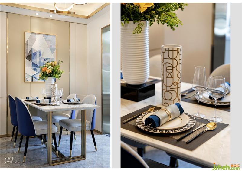 餐椅使用靛藍(lán)色的捫皮和克里斯灰色,加上大理石材質(zhì)的餐桌,讓氣質(zhì)美學(xué)體現(xiàn)到極致!