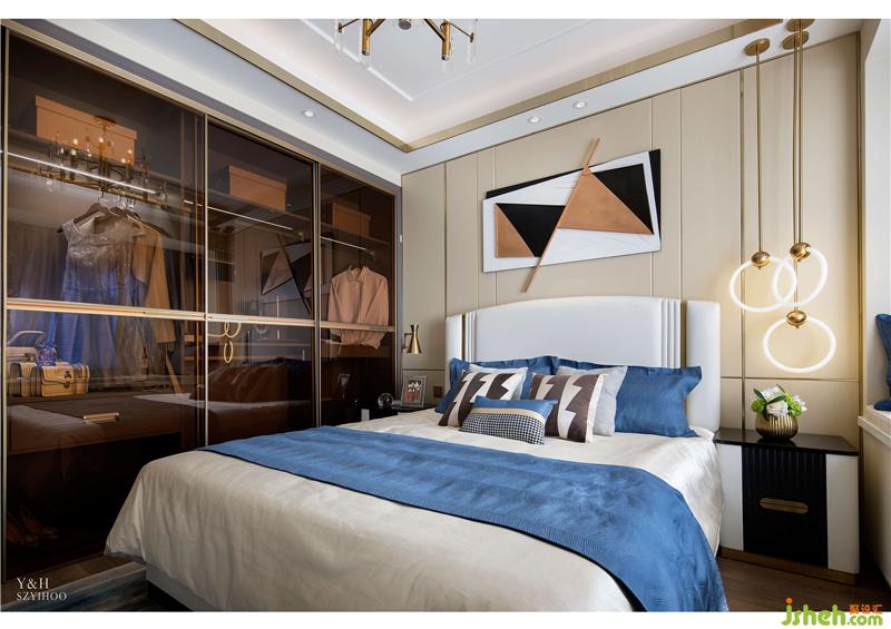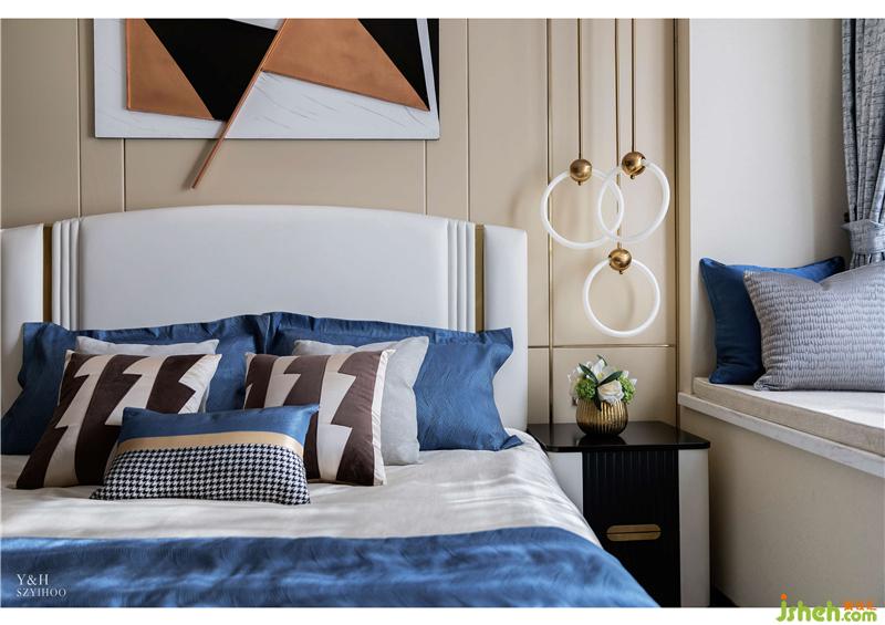 主臥摒棄繁復(fù)冗雜的擺設(shè),用簡潔明了的語言勾勒出生活的質(zhì)感,富有創(chuàng)造力的幾何掛畫增添空間的藝術(shù)內(nèi)涵。抱枕與地毯深淺不一的藍(lán)色,避免了色調(diào)的單一,使主臥空間層次感加強(qiáng)。