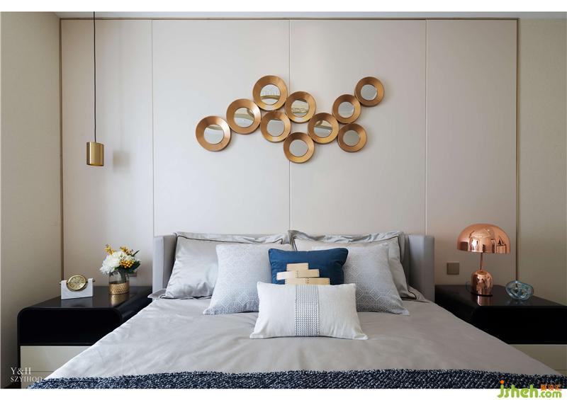 長輩房間的黃銅小吊燈與設(shè)計(jì)感十足的不規(guī)則金屬掛鏡。