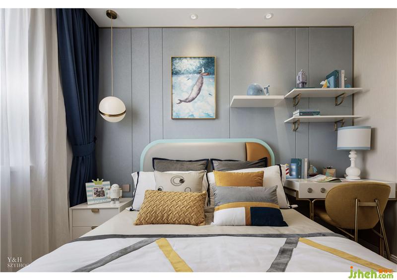 兒童房為孩子置辦了書桌,書桌上方鯨魚與機(jī)器人的擺件使兒童房別有風(fēng)趣。黃色與藍(lán)色的窗簾帶來了視覺上的沖擊,為整個(gè)空間營造了活潑的氛圍。