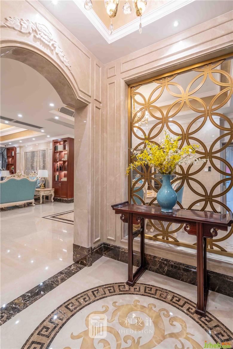 室內(nèi)設(shè)計師以現(xiàn)代歐式風格為基調(diào),用現(xiàn)代的表現(xiàn)手法呈現(xiàn)一個歐式的空間。選取歐式的設(shè)計精華,與東方意象的設(shè)計符號進行融合,使空間整體風格添加一絲的靈性。精挑細選的雕塑擺件成為玄關(guān)中醒目的元素,為現(xiàn)代歐式氛圍注入東方中式色彩 。