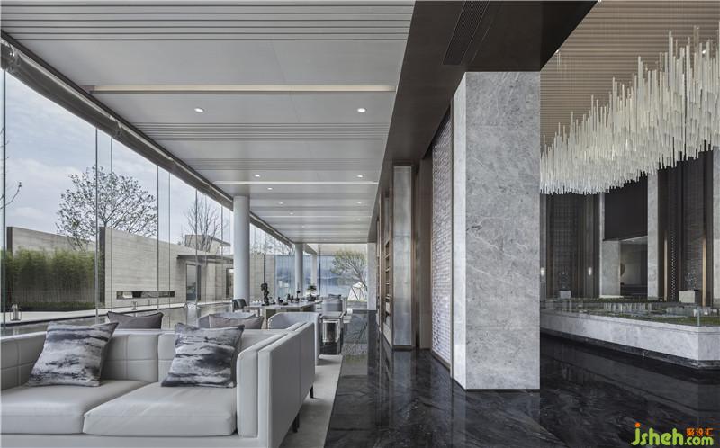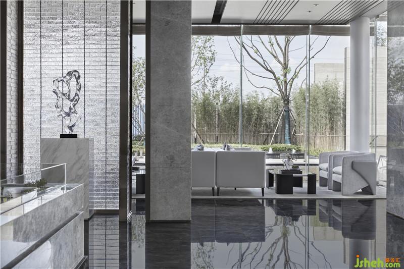 尊重每一次交流,享受每一段思考 —— VIP洽談區(qū)位于沙盤區(qū)的左側(cè),以灰白色為主色調(diào),鋪陳近似水墨山水的東方基調(diào),細膩地呈現(xiàn)出一個優(yōu)雅、寧靜的空間,同時自然地與窗外的水景相交融,影影綽綽的光感,更讓空間靈動起來,孕育了無形的生命力。
