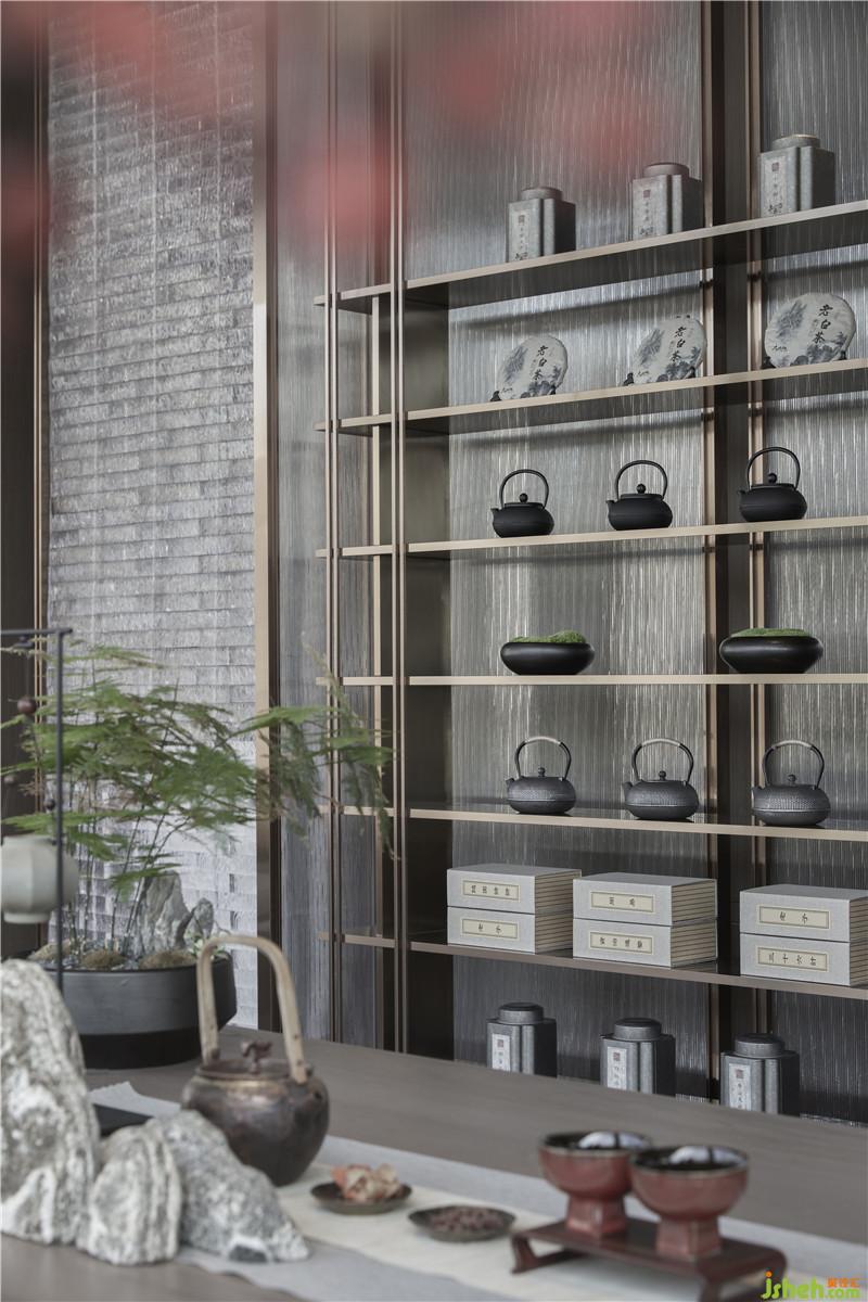 純粹的線條結(jié)構(gòu)在空間內(nèi)全方位地構(gòu)建,頂部的木柵條將自然光引入空間,強調(diào)線條感的燈飾與下方沙盤區(qū)形成呼應(yīng)對立,仿佛連成一體的裝置,暗將藝術(shù)感融入到空間的展示中。東方文化中所特別強調(diào)的“含蓄”被精準地表現(xiàn)于此,含而不露、不動聲色的力道,既豐盈亦懂得節(jié)制。