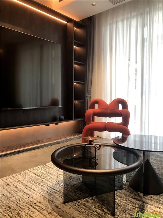 推拉門形成一個面,延長推拉門暗藏軌道做成燈帶形成線,線與面的結合,面于線上移動,同時在電視背景墻頂上設計一條平行燈帶形成兩條相互平行的長線,深圳家居設計既解決了照明問題,增加了空間的氛圍感,也讓整個空間多了一分張力。