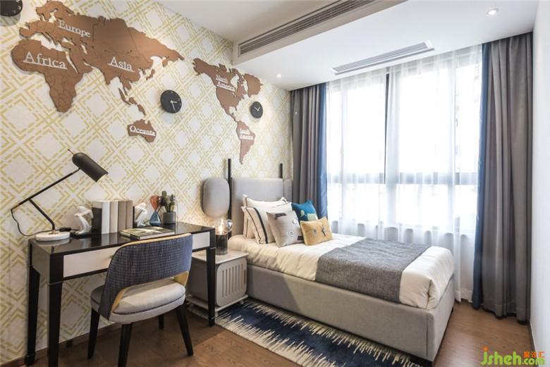 世界地圖的自由變化使得整個空間更加有層次感,令這個空間顯得更加生動、活躍,醒目跳躍地的床品與擺設(shè),無不與低調(diào)的家具形成對比,令空間更添濃郁的藝術(shù)氣息,時時刻刻啟發(fā)孩子們的靈感