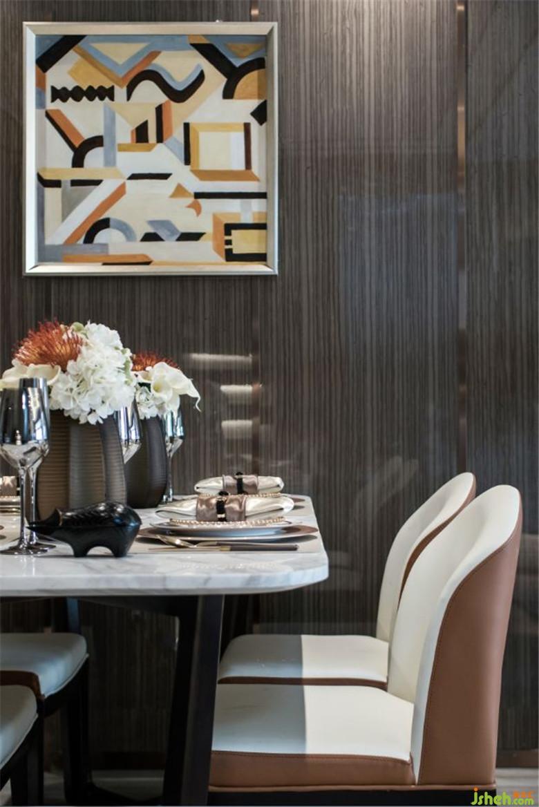 餐桌臺面選取雅士白大理石,天然石材的自然紋路,搭配大束繡球花藝組合。餐巾餐扣選取金屬馬鞍扣造型,組合圓點陣列構(gòu)成的餐盤,使得整個臺面大方有序且不失精致。方形底盒吊燈搭配三棱水晶柱,風(fēng)影變換之下產(chǎn)生粼粼波動。