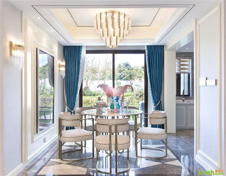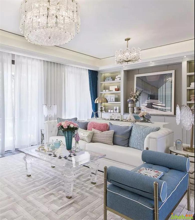 進(jìn)入客廳,宛如感受了現(xiàn)代與上世紀(jì)初巴黎藝術(shù)風(fēng)格在此邂逅,灰藍(lán)色與粉色構(gòu)成強(qiáng)烈的對(duì)比,通過(guò)水晶燈具的搭配,渲染上一層奢華情調(diào),做工精巧的飾品、金屬線條的燈具,碰撞出極具韻律感的視覺(jué)沖擊,無(wú)不散發(fā)著奢華、雅致的空間氣質(zhì)