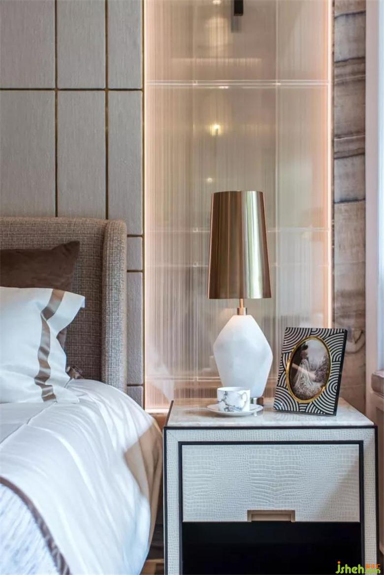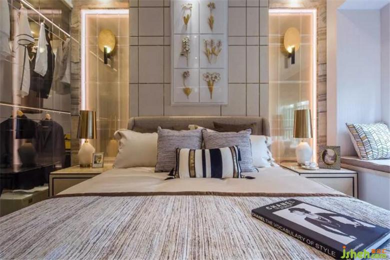 步入主臥,大空間帶給人一種十分舒服的空間感,金色燈飾和花藝構(gòu)成工藝畫相互結(jié)合起到了提亮空間的作用,縱橫交錯(cuò)的金線條與掛畫相互輝映,給人帶來一種突破常規(guī)的感覺。