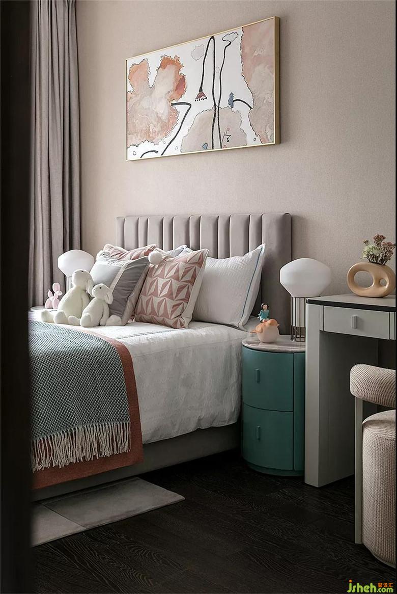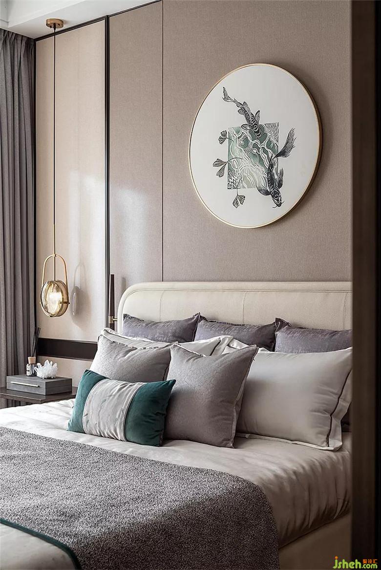 主臥選用淺杏色為背景主調(diào),在木質(zhì)、軟包材料的拼接下,加入品綠色點(diǎn)綴,畫(huà)幅魚(yú)兒躍然于紙,增加了空間質(zhì)感的豐富性。