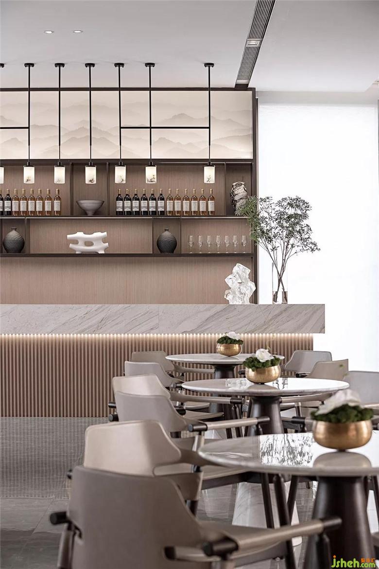 洽談區(qū)座位對稱排布,疏落有秩,色彩如淡水墨漬染宣紙一般,雅白、卡其、原木色洋洋灑灑揮寫,配合簡約內(nèi)斂的木材肌理,取得適宜生活的溫度平衡。懸掛的山水紗簾,素雅的瓷器,未經(jīng)打磨的天然原石等,同時散發(fā)出和諧統(tǒng)一的東方情調(diào)。
