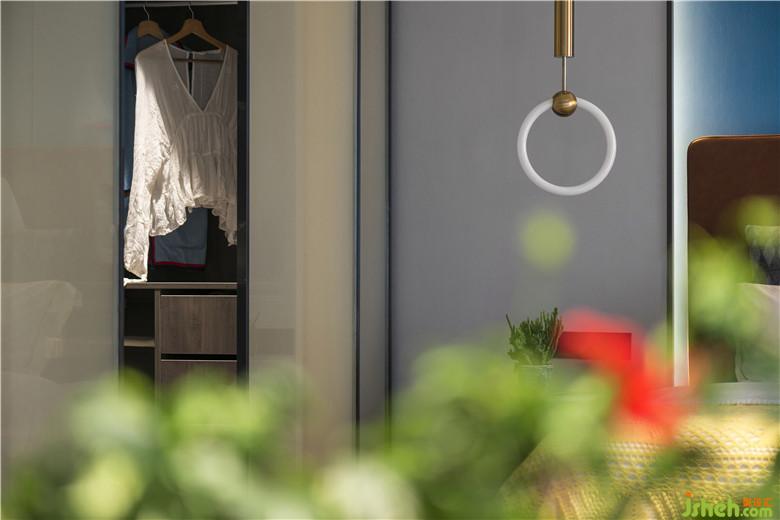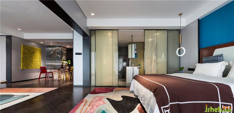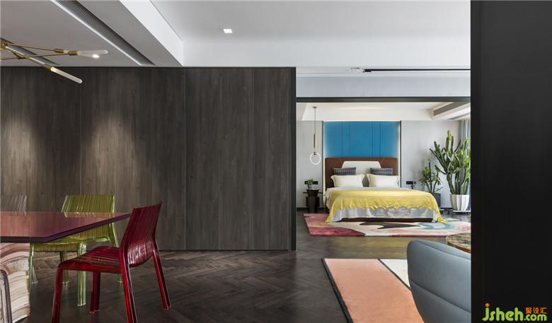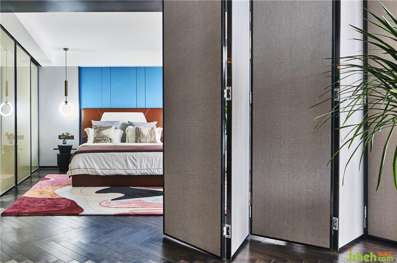 主臥床頭背景室內(nèi)設(shè)計師采用深藍(lán)色有助睡眠與休息,胡桃木色系的地板搭配讓空間更有質(zhì)感與穩(wěn)重