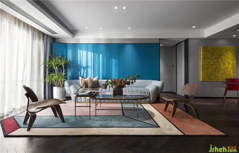客廳看起來大氣時(shí)尚,藍(lán)色的背景墻盡顯活力,簡約的桌子,室內(nèi)設(shè)計(jì)師搭配兩張?zhí)厣囊巫?,再加上有風(fēng)格的地毯,整個(gè)空間微妙微翹的舒適