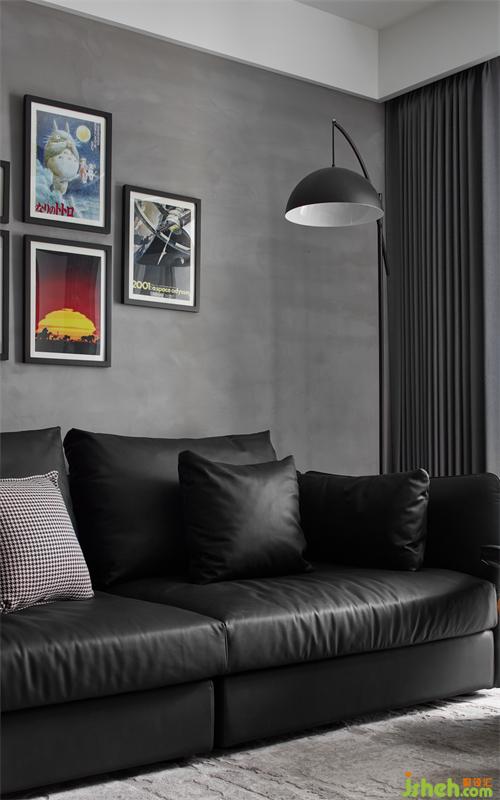 將家人喜愛的海報劇照作為裝飾畫,讓空間多了一絲趣味,中和了工業(yè)水泥灰墻面的冷硬感和黑色落地沙發(fā)的厚重感,搭配射燈與落地燈,為理性的空間增添一絲家的溫暖。