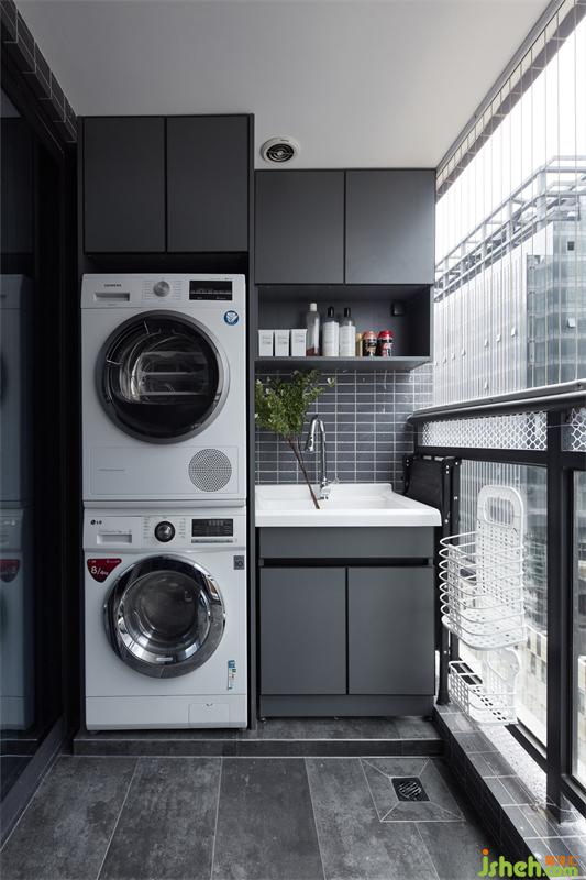 陽臺一側(cè)定制整墻儲物柜,嵌入洗衣設備與洗手臺,滿足屋主需求。洗衣臺底部抬高設計,防止洗衣機和柜體受潮,高級的灰色調(diào)鋪滿墻面地面,搭配深灰色柜體,表現(xiàn)得耐看而有層次感。