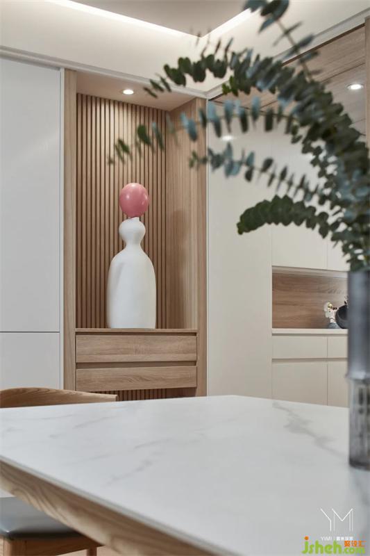 餐廳望向玄關,木格柵串聯(lián)空間,傳遞著次序美感。
