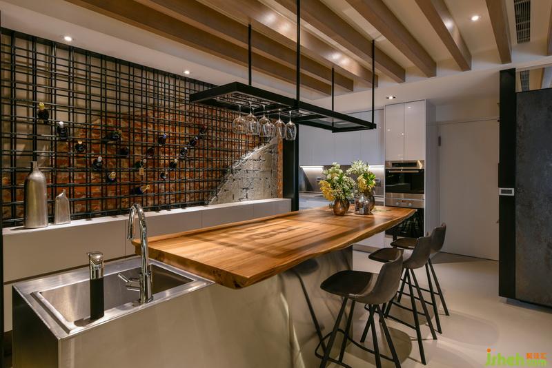 餐廳設計公司以工業(yè)風格的酒架及餐桌作為視覺中心,傳達出屋主熱情的待客之道。