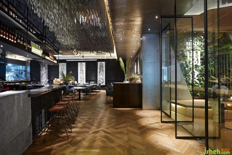 閱食從最初始的情感記憶出發(fā),從中國(guó)傳統(tǒng)爐灶中以木材升火的烹煮方式為靈感,室內(nèi)設(shè)計(jì)師將「碳」所代表的飲食文化與自然凈化的概念,融入現(xiàn)代空間設(shè)計(jì)中。從入口與吧臺(tái)區(qū)的大型吊掛原木裝置、開(kāi)放座位區(qū)的黑巖墻面與炭畫、以及開(kāi)放廚房區(qū)搭配的煙熏橡木地板,室內(nèi)設(shè)計(jì)師「碳」以更細(xì)膩人文的手法融入空間。大量的光灑落在綠意的植栽園藝,在碳木交迭的場(chǎng)域氛圍中,人自然地放慢了步調(diào),愜意、更自由地享受「食」的時(shí)光。