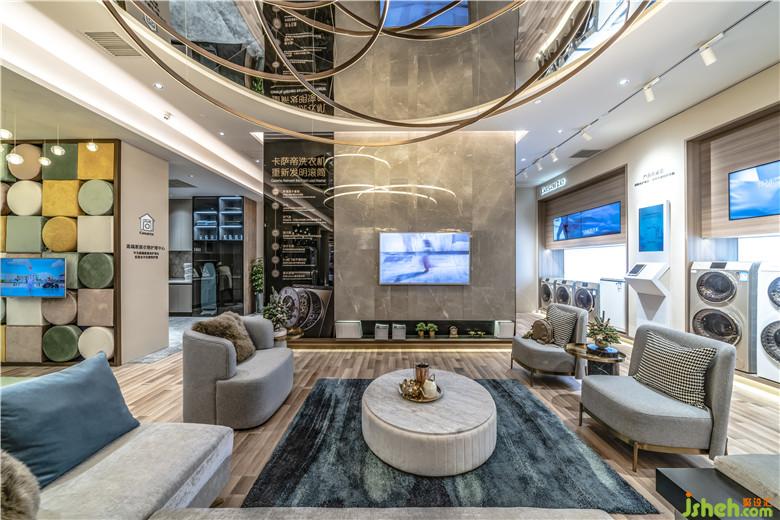 入口形象區(qū)以水鏡倒影與漣漪之光的設計,做為門市主題的開場呈現(xiàn),延伸了天花的空間視覺感。柔和的大地質(zhì)感做為水流與日光間的緩和過場,產(chǎn)品展示區(qū)、衣帽間、洗衣房特別加入木質(zhì)拼接地板、木頭格柵、大理巖面、灰楬皮革等自然質(zhì)地的材料,提升舒適氛圍。