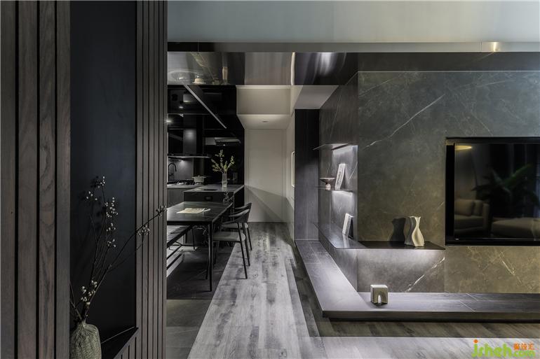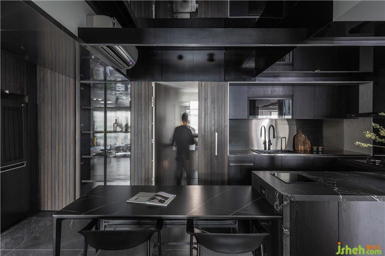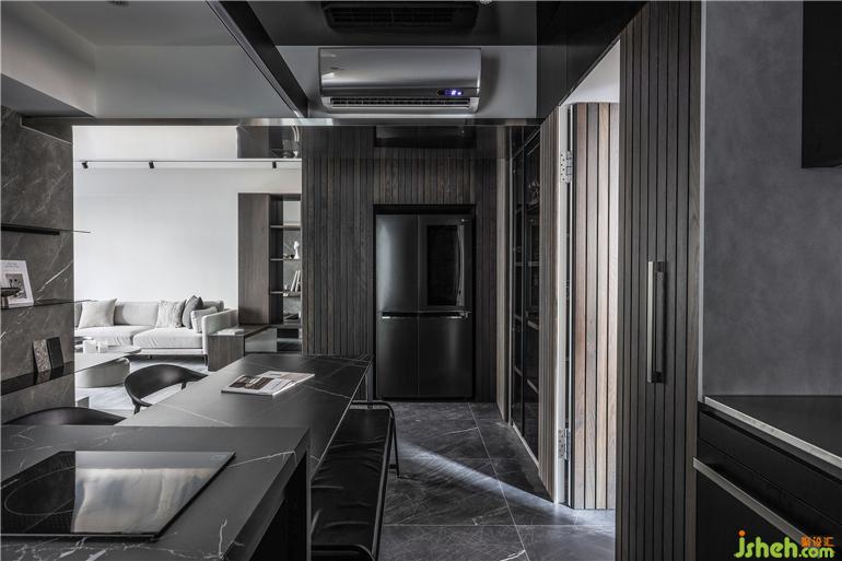 餐廳的氛圍獨特,運用異材質(zhì)本身的低彩度與肌理,鋪陳出沉穩(wěn)內(nèi)斂的質(zhì)地之美。墻面與柜體挑選不同深淺的實木,中島與用餐區(qū)混搭了多種紋樣的石材,一抹霧化的金屬光澤適度的引入,材質(zhì)共融的形式跳脫了呆板的框架,緩和深色空間的沉重感。天花的黑鏡延伸了場域的尺度,倒映著料理時的專注神情,以及共餐時的談笑細(xì)語,生活的想象原來是如此的立體有溫度。