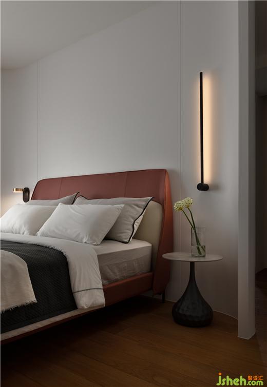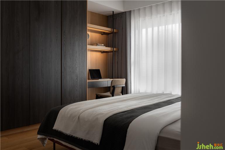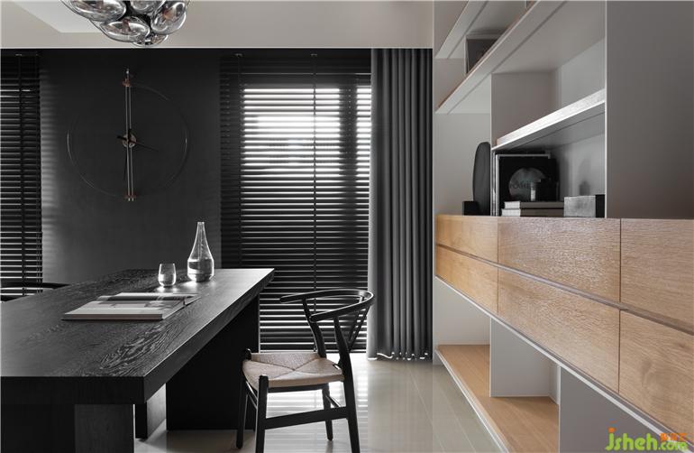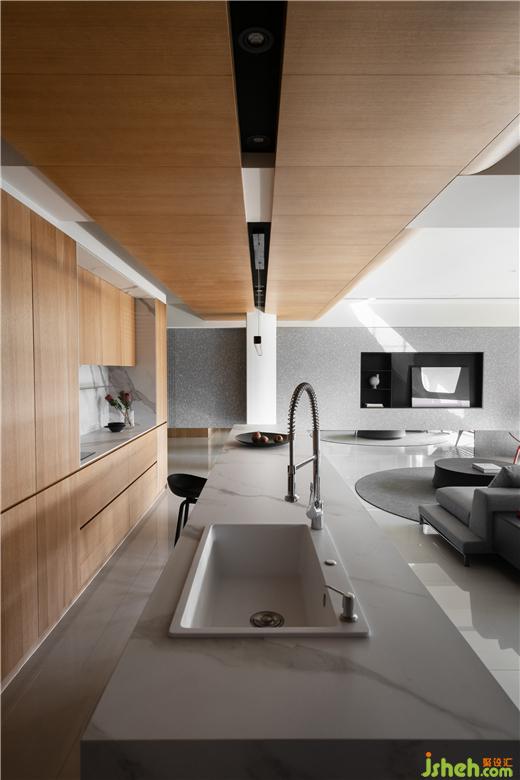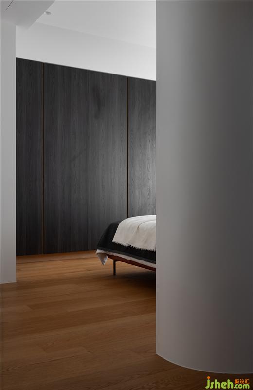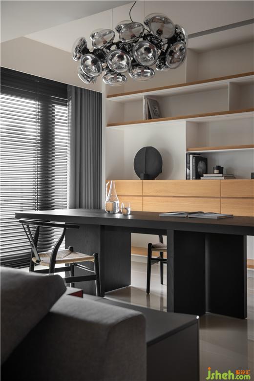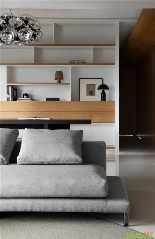寬版黑色鋁百葉,靈活調(diào)整光線變化過濾掉晨間城市的喧囂,裝修設(shè)計(jì)引進(jìn)夜晚華麗燈火闌珊,為中性基調(diào)的客廳灑上一抹靜謐的時(shí)光。電視主墻與空間內(nèi)圓弧的導(dǎo)角柔化墻面銳利的交界處,墻面上選用了細(xì)點(diǎn)灰白相間的水磨石,保留了材料原始的質(zhì)地與質(zhì)樸之感,墻面底部的漂浮結(jié)構(gòu)使用「減」的手法,減去石材墻面的量體,提升輕盈感,明鏡面反射了地坪鋪面的倒影延伸放大了空間。頂部30公分的留白,營造出天花推高擴(kuò)大的錯視感,采用與天花相同的白色,使原本壓迫空間的橫梁,像是消融于之間,既存在又隱藏,轉(zhuǎn)化為堆棧空間層次的對象。