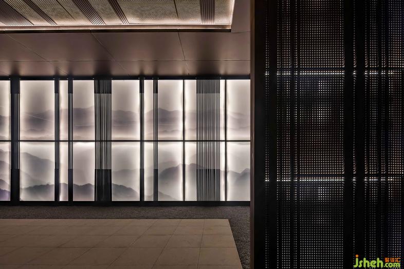 室內(nèi)設(shè)計師在前廳與展廳的連接處,設(shè)計師開創(chuàng)性的做了一個有序列感的“門廊”設(shè)計。門是中國傳統(tǒng)文化的縮影,通過一進(jìn)一出,便能感受到儀式感和莊重感。設(shè)計師通過在兩側(cè)設(shè)置裝飾屏風(fēng)和陳設(shè)藝術(shù)品,營造出一種“門廊”的抽象概念,使其在整體空間內(nèi)既具古風(fēng)又不顯突兀。