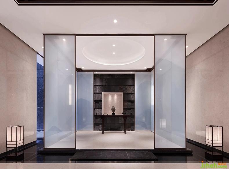 禪堂位于負二層光院西側(cè),半通透設(shè)計的圍合玻璃墻讓自然的氣韻自由穿梭。室外墻面的肌理與通透的玻璃材質(zhì),賦予空間謙和的靜謐的氣息。禪堂的靜與水景的動形成對照,整個空間禪而不寂,展現(xiàn)出一種樸素的渾然天成之美。致虛極,守靜篤。主人在家中修行,心光回照,感受到云水自在般的灑脫。