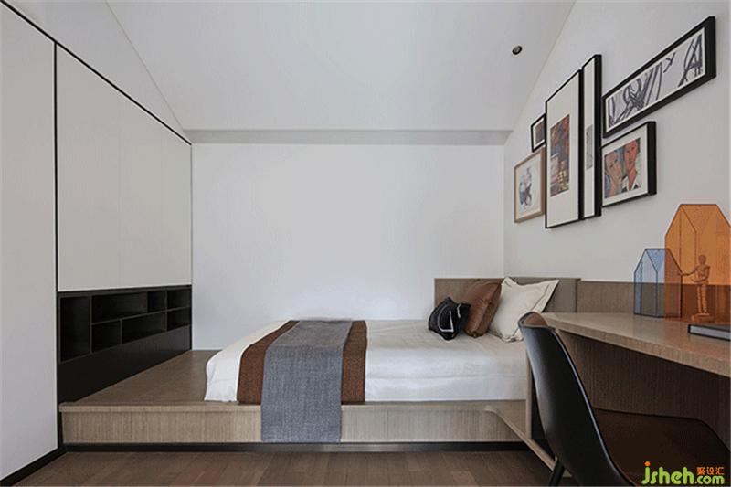 次臥為男孩房,床體造型與書桌采用一體化手法打造,有效節(jié)省了空間。墻面以掛畫及藝術(shù)品等多種元素打造一個充滿藝術(shù)感與現(xiàn)代感的空間。