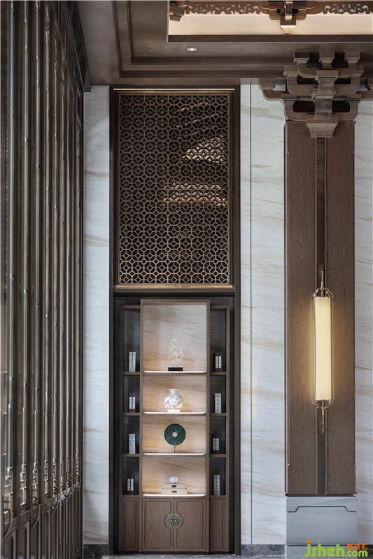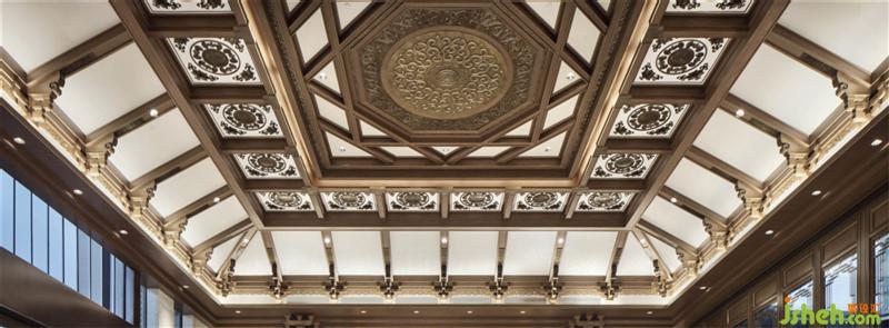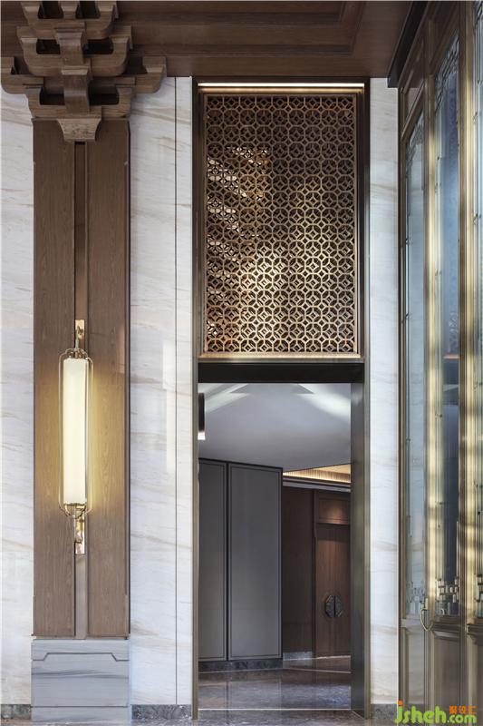接待區(qū)中庭高達(dá)9米,八邊形元素被巧妙融入到天花、地面和墻面中,四方一統(tǒng),八面來客,展現(xiàn)”嶺南福邸“的概念。天花借用中國(guó)傳統(tǒng)建筑中樑架結(jié)構(gòu)和藻井形式加以演變?cè)煨停窕皞鹘y(tǒng)中式圖樣紋案被運(yùn)用于其中,與四根斗拱構(gòu)架的柱式結(jié)構(gòu)和八邊形地面相呼應(yīng)。裝修設(shè)計(jì)