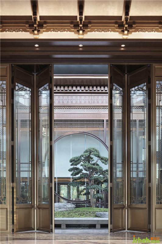 “巧于因借,精在體宜”。高達(dá)六米開合有序的金屬銅門將庭院的山水情境與如畫美卷徐徐展開。