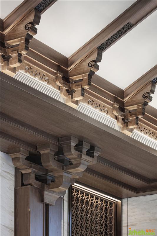 “山”為風(fēng)骨,“云”為志向。接待臺區(qū)背襯巨幅漆畫木雕花,將山、云元素精鏤細(xì)刻,融為一體。駐足觀瞻之際,仿佛身已在深山中,山中有云,云中有山,空間的禪意被自然地渲染而出。兩側(cè)對稱置暖色燈帶,帶來一絲安靜與溫潤氣質(zhì)。接待臺輔以水晶玻璃磚飾之,與古銅色不銹鋼形意合一,都市文化與傳統(tǒng)氣息于此交融。裝修設(shè)計(jì)