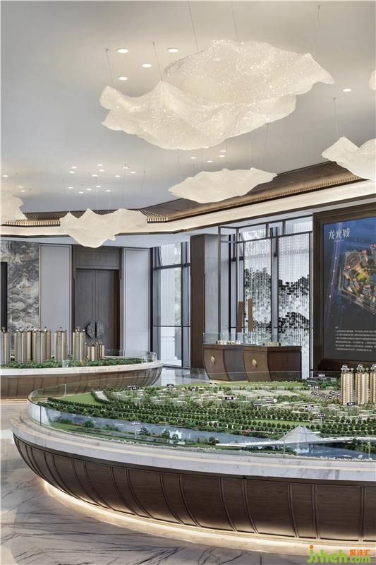 模型圖后另設(shè)山水紋水晶玻璃屏風(fēng),繁縟而有節(jié),化為映像的細(xì)聲,既是美的展示,又適宜空間的分割,影影綽綽之間感受“清風(fēng)徐來,水波不興”之境。裝修設(shè)計(jì)
