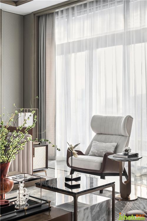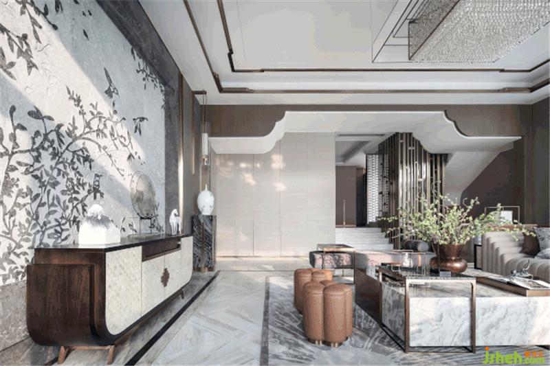 客廳主背景墻以《鬧春》為主題概念,采用了3.2米高復(fù)合工藝花鳥石材背景墻,光面、水洗及噴挖三種工藝,讓石材呈現(xiàn)出具有肌理感的表面,結(jié)合花鳥圖案,展現(xiàn)空間的主題與雅致格調(diào)。雙層透疊藝術(shù)玻璃屏風(fēng),與庭院虛實掩映。