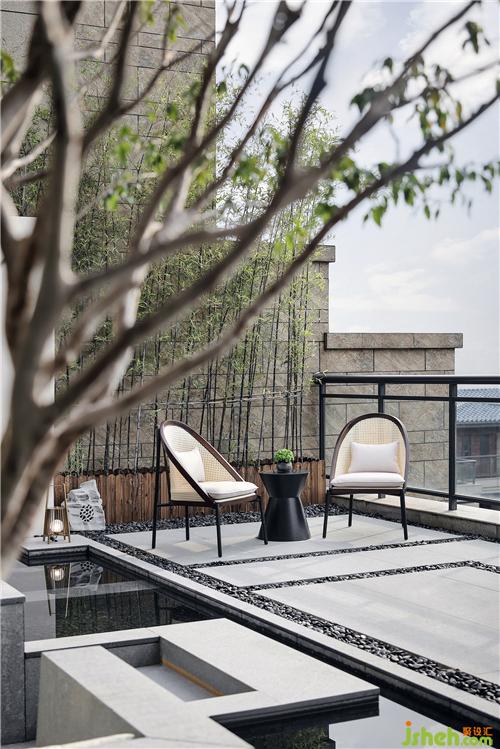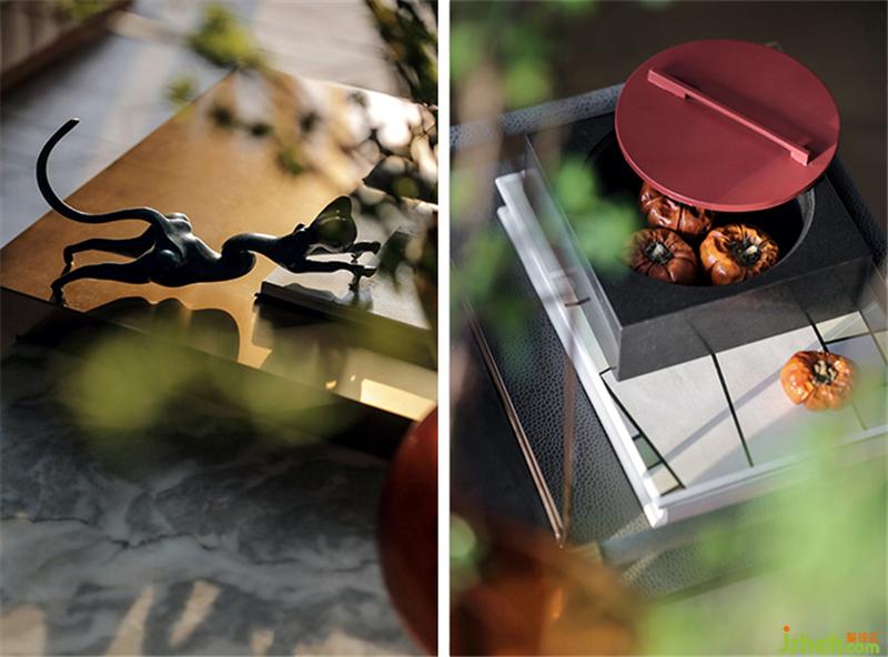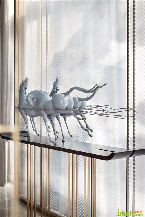 一層客廳與庭院相連,視野開闊。庭院內(nèi)設(shè)有下沉式水景休息區(qū)以及水幕簾景觀墻,庭院水池間設(shè)有下沉休息區(qū),讓人們在休息時更加親近大自然,給人不一樣的視角和體驗?!霸倩厥住苯饘偎囆g(shù)馬是樣板房設(shè)計師專門為庭院空間打造的藝術(shù)雕塑,多棱鏡面的反射讓物象自然相映,青山綠水,雍容自在。