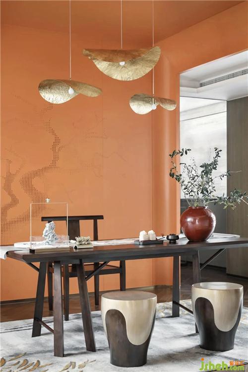 一樓書房的整體配色的靈感來自“山海經(jīng)”主題元素中的自然要素和人文地理的內(nèi)容。橙色鏤空背景溫暖摯熱,吊燈以傳統(tǒng)文化“蒲扇”為符號,以純銅為材質(zhì),又似荷塘蓮葉,以物抒情,給空間增加了寫意的人文氣息。